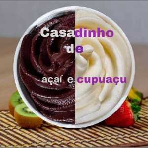 Meio litro de açaí com camadas de leite em pó e frutas.